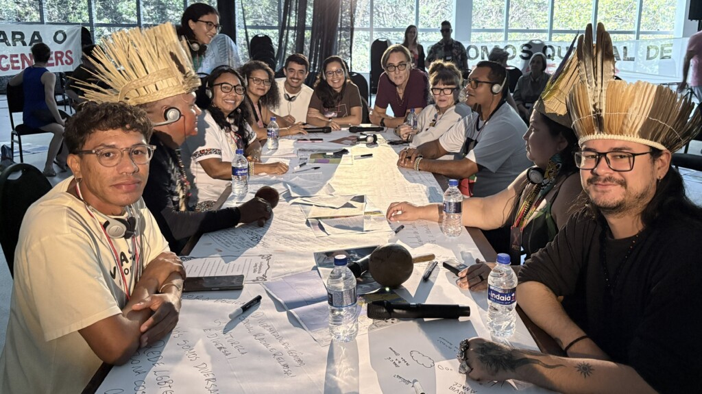 Lois opened the table to Valneide Sousa, a leader from the Sabiaguaba Settlement engaged in the struggle for land rights, and Ayô Herú de Sousa Holanda, a Black non-binary trans person, educator and cultural activist who coordinates the Êpa Pretu collective. Quilombola communities were represented by João do Cumbe, a human rights defender and educator who speaks out against the impacts of wind energy, and Cleomar Ribeiro da Rocha (Clea do Cumbe), a fisherwoman, environmental activist and president of the Cumbe Quilombola Association. The Anacé people were represented as a family: leader Aurea Anacé, an Indigenous producer and coordinator of the Brotar Cinema school; Mariano Anacé, a student and filmmaker; and the General Chief Roberto Ytaysaba Anacé, a teacher and defender of human and environmental rights, whose territory has been impacted by the construction of data centres.