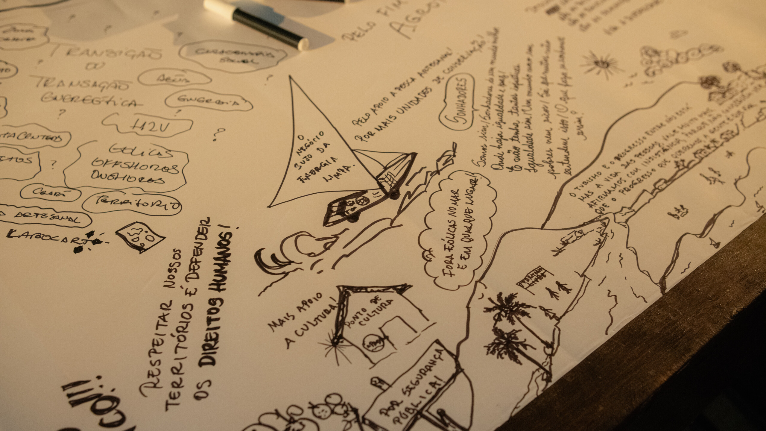 Around the table, around 50 people took part in an open conversation accompanied by gestures, drawings, maps, memories, and expressions recorded on paper, which itself became a shared territory of collective expression.