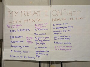 The poetry workshop invited the young people to explore their relationship with mental health both individually and in groups. Using the metaophor “My Relationship with Mental Health is Like,” the group were encouraged to share their knowledge and experience to create a space whereby they could communicate their thoughts and feelings through the artform of poetry. Individually they gave responses and then as small collectives, they were allowed to pick one phrase to delve into. Through this collaboration, a mixture of poetry, rap songs and drawings were produced.